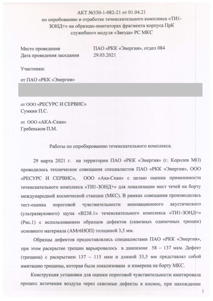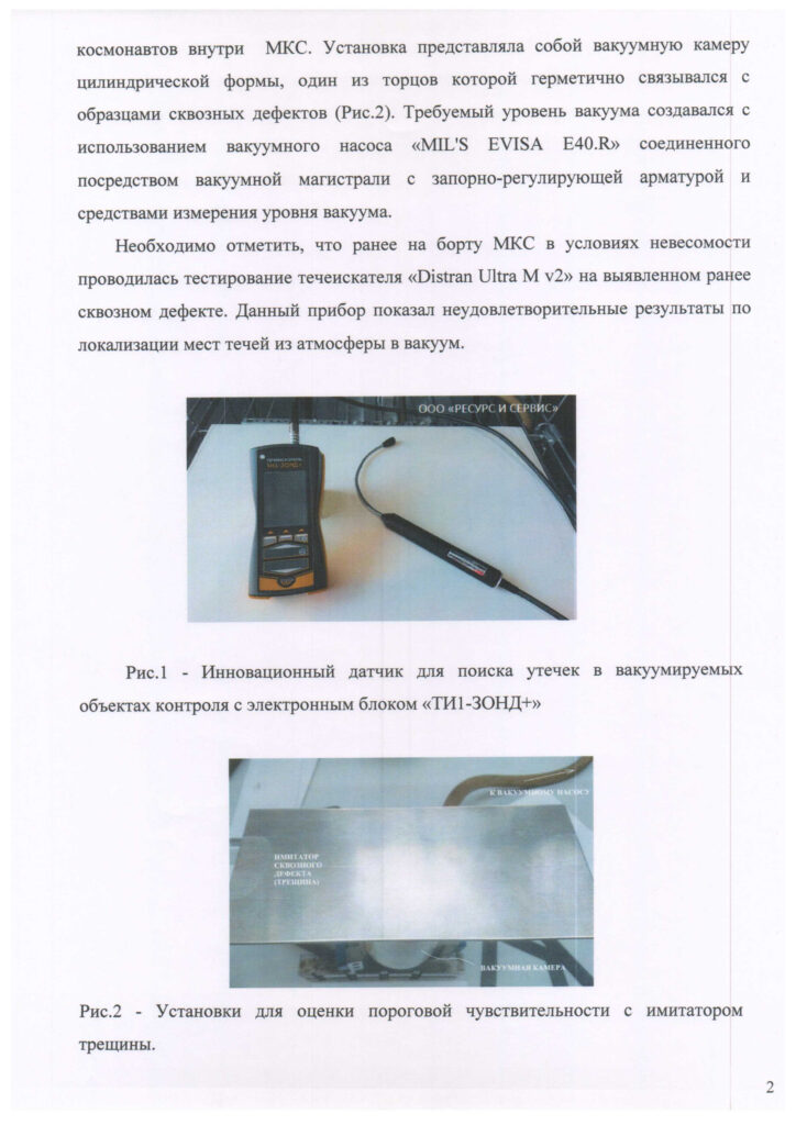 ООО “РЕСУРС И СЕРВИС” осуществило разработку, поставку инновационного щупа В.238.1 для поиска утечек на модуле “Звезда” РС МКС, а так же была произведены работы по опробированию течеискательного комплекса.
