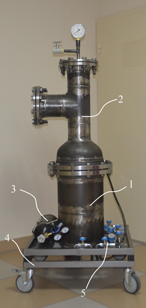 Рис.1 Комплексное устройство «РЕСУРС-АЭ»: 1- сварной вертикальный резервуар; 2- система разветвленных трубопроводов, связанная с резервуаром; 3-баллон с пробным газом азотом; 4- передвижная тележка со стопорным механизмом; 5- подводящая запорно-регулирующая арматура и средства измерения давления пробного газа.