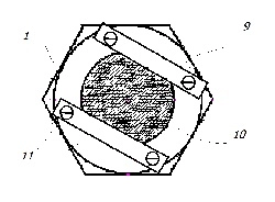 На Рис. Г представлен элемент контрольной течи (вид сверху) для проверки нижнего порога чувствительности акустического газового способа, содержащий: 1 - прижимная гайка, 4 - критическое калиброванное микро сопло, выполненное во вставке, 5 - выполненная в гайке калибровочная емкость, 10 - сетчатый элемент, 9 - прижимные планки для фиксации сетчатого элемента, 11- фиксирующие винты.