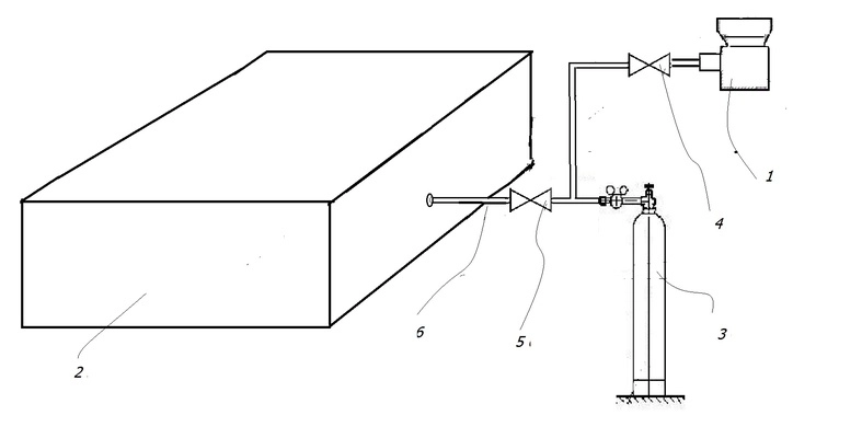 1 –контрольная течь в сборе; 2-объект контроля; 3- баллон с контрольным газом (или иное средство создания контрольной среды) 4, 5 – газовые клапаны. 6- штенгельная заправочная трубка