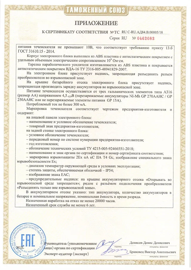 Величина регистрируемых потоков газа и жидкости, л/ч Без параболического усилителя (при избыточном давлении не менее 0,1 кГс/см, расстояние до объекта контроля — 5-10 мм) С параболическим усилителем (при избыточном давлении не менее 0,1 кГс/см, расстояние до объекта контроля — 200 мм и более до 40 м) | 100 и более 100 и более |